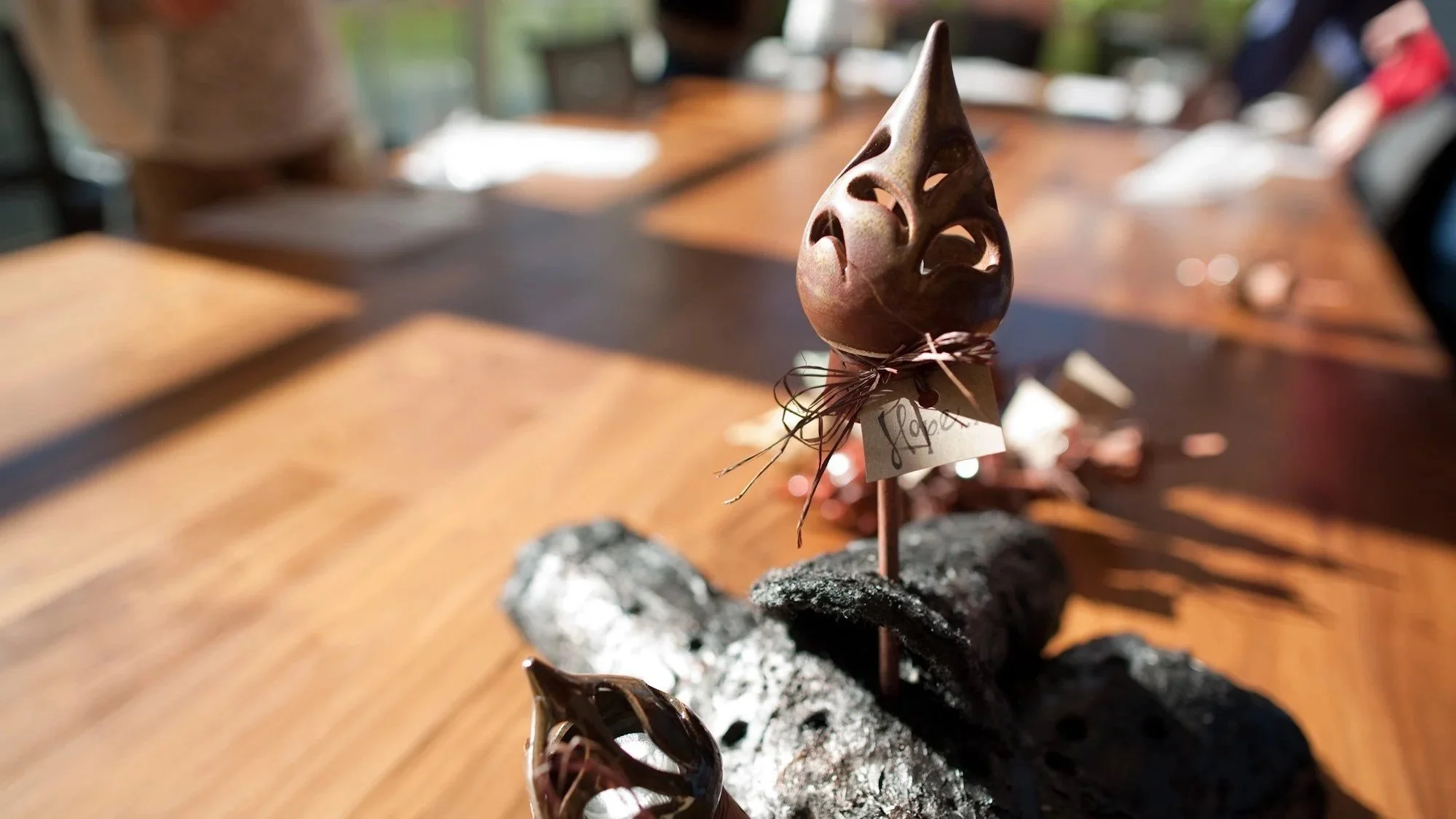 The group focused on emotional energy decided to use a year-end gathering to craft a special experience for the staff. They first created a survey that asked employees to provide 3-5 words to describe how each of their colleagues was delightful (sound familiar?). The results were compiled and handed over to artist and ceramicist, Sheri Jarvis. The group shared with her their goal of building a ritual that would create a positive emotional experience and they were drawn to the memory of sitting around a campfire. Sheri took it from there and what she devised was brilliant.